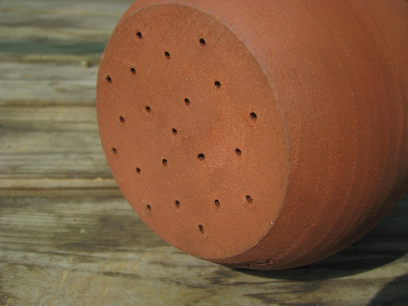 Aus Ton gefertigt, in den Niederlanden von Hand auf der Scheibe gedreht ist diese Pflanzendusche oder Tonbrause. Es handelt sich um einen Ballon aus Ton, oben ist ein größeres Loch und unten ganz viele kleine. Taucht man das gute Stück nun in einen Wassereimer, füllt es sich blubbernd mit Wasser und wenn Sie dann den Daumen auf das große Loch halten, können Sie den gefüllten Tonkörper aus dem Wasser ziehen, er bleibt gefüllt.